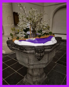 op het doopvont staat en elke week wordt aangepast door de bloemengroep.